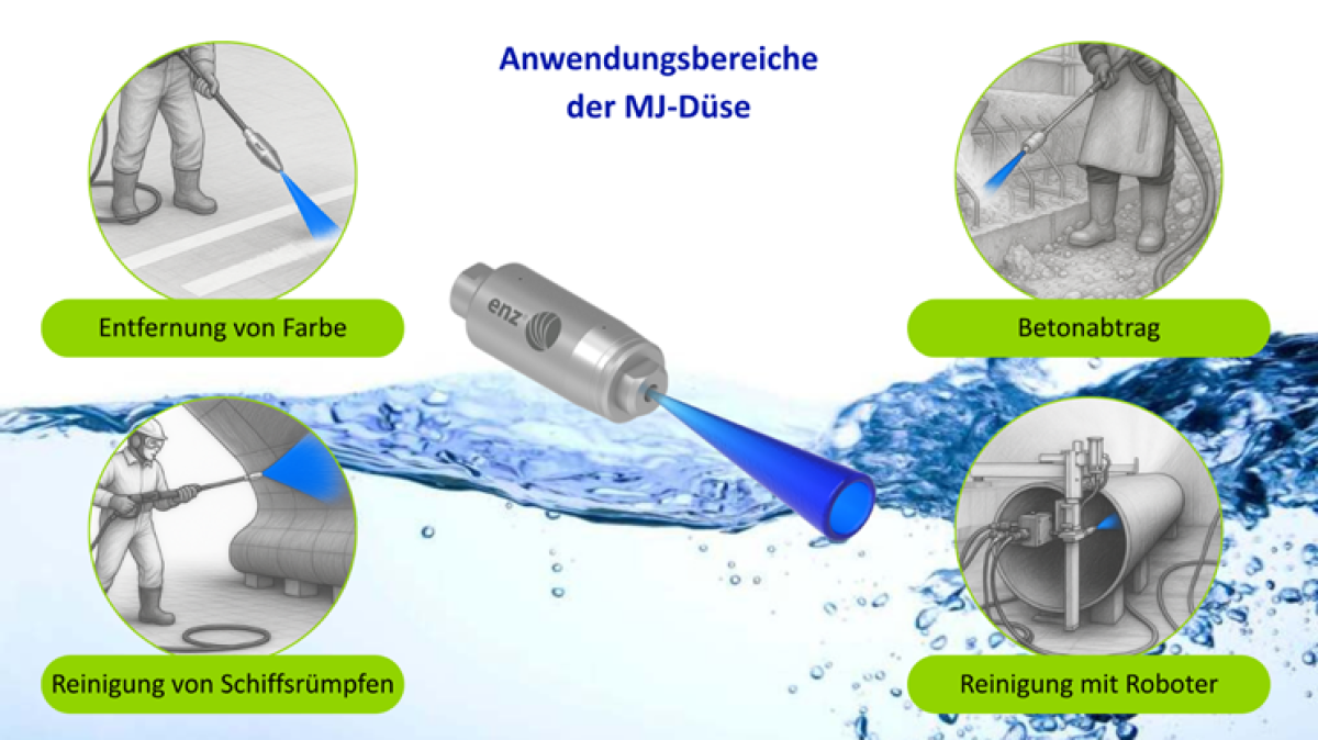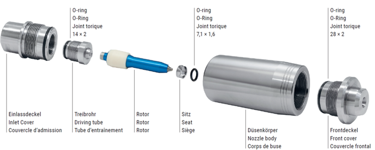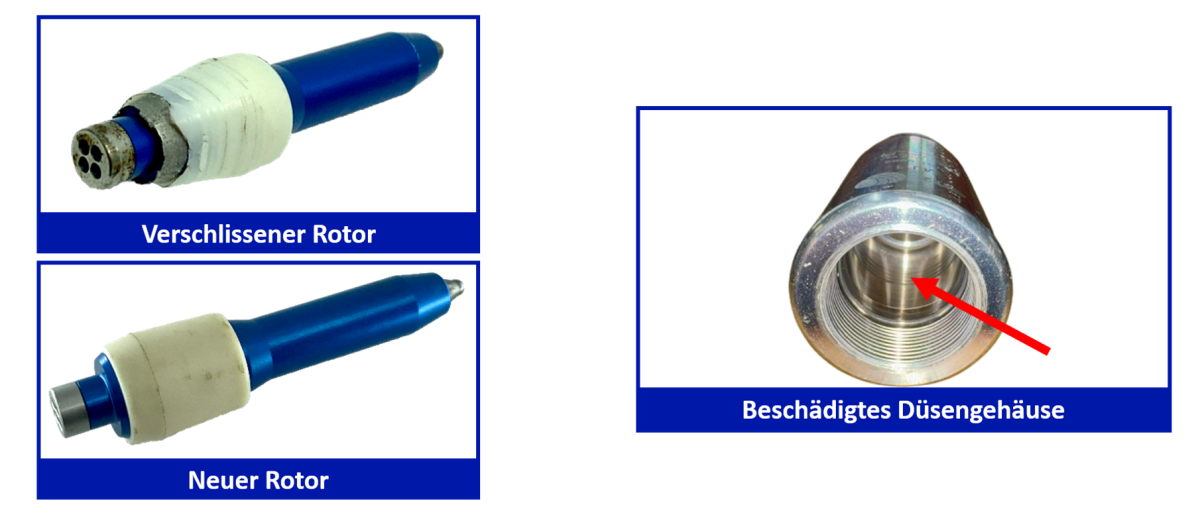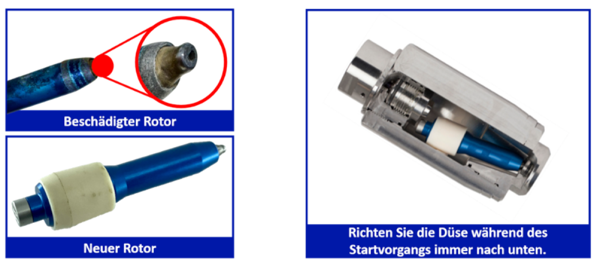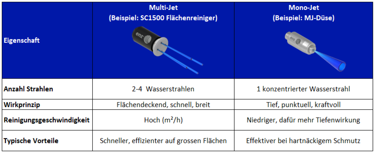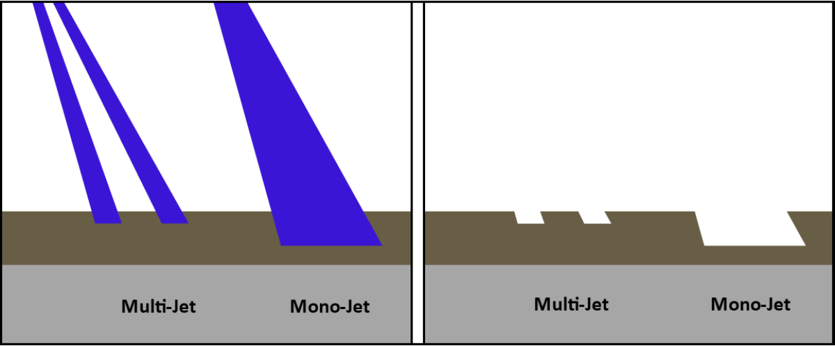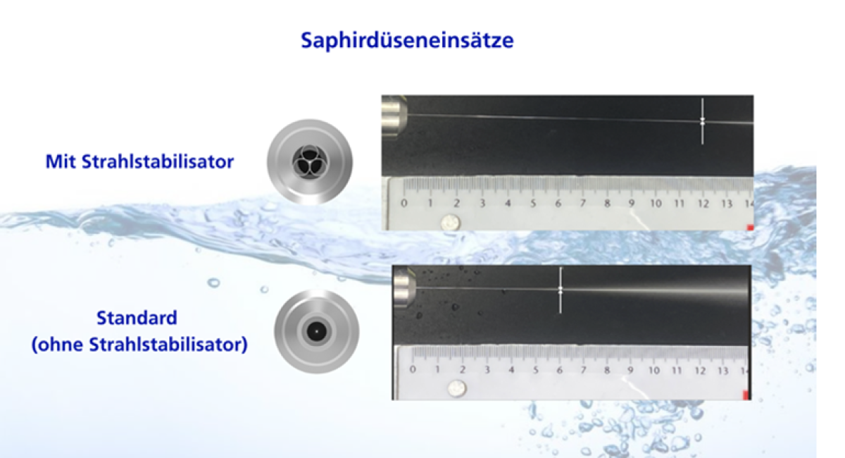 Saphireinsätze mit und ohne Strahlstabilisator Im Hochdruckbereich von 1000 - 3000 bar (15,000 - 43,000 psi) setzen wir häufig auf Edelstahl-Saphireinsätze. Im Vergleich zu herkömmlichen Materialien wie Keramik oder Stahl bieten sie eine deutlich höhere Leistungsfähigkeit (Spülstrahlleistungsdichte), längere Standzeiten und sind ideal für den Einsatz mit Frischwasser geeignet. Unsere Saphireinsätze sind in zwei Ausführungen erhältlich: Mit Strahlstabilisator oder als Standardversion (ohne Strahlstabilisator). Der Strahlstabilisator sorgt dafür, dass der Wasserstrahl über eine deutlich längere Distanz präzise und gebündelt bleibt – für maximale Tiefenwirkung und gesteigerte Effizienz (höhere Spülstrahlleistungsdichte). Das untenstehende Beispiel verdeutlicht diesen Effekt eindrucksvoll: Während der Wasserstrahl der Standardausführung bereits nach etwa 6 cm zu zerstreuen beginnt, bleibt er mit Strahlstabilisator bis zu 12 cm lang gebündelt. |